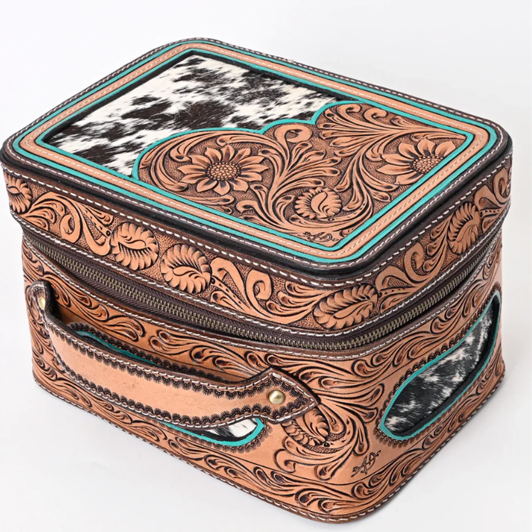 This stunning jewelry case has plenty of room for all your beautiful goodies. The top of the case features a place to put your necklaces as well as earrings on the leather strap.Â