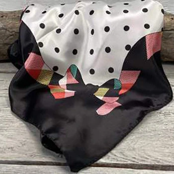 This classic wild rag is in a fun and cute polka dot pattern. A crisp white background with black polka dots and a black trim all tied together by the design of a striped bow.Â