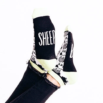 These crew socks feature sheep on the top and the saying black sheep on the bottom. Toes and heels have extra padding to keep your feet comfy.