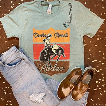 The perfect ranchy tee, Cowboy Ranch Rodeo , is a Western Edge favorite! On a dusty sage color, is a fun and fresh look.Â