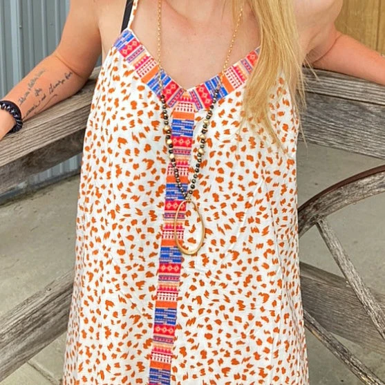 This long summery dress is perfect for those casual yet dressy occasions! The Aztec embroidery on the front of the dress and neckline adds just the right amount of color to make this dress even more summery! Â