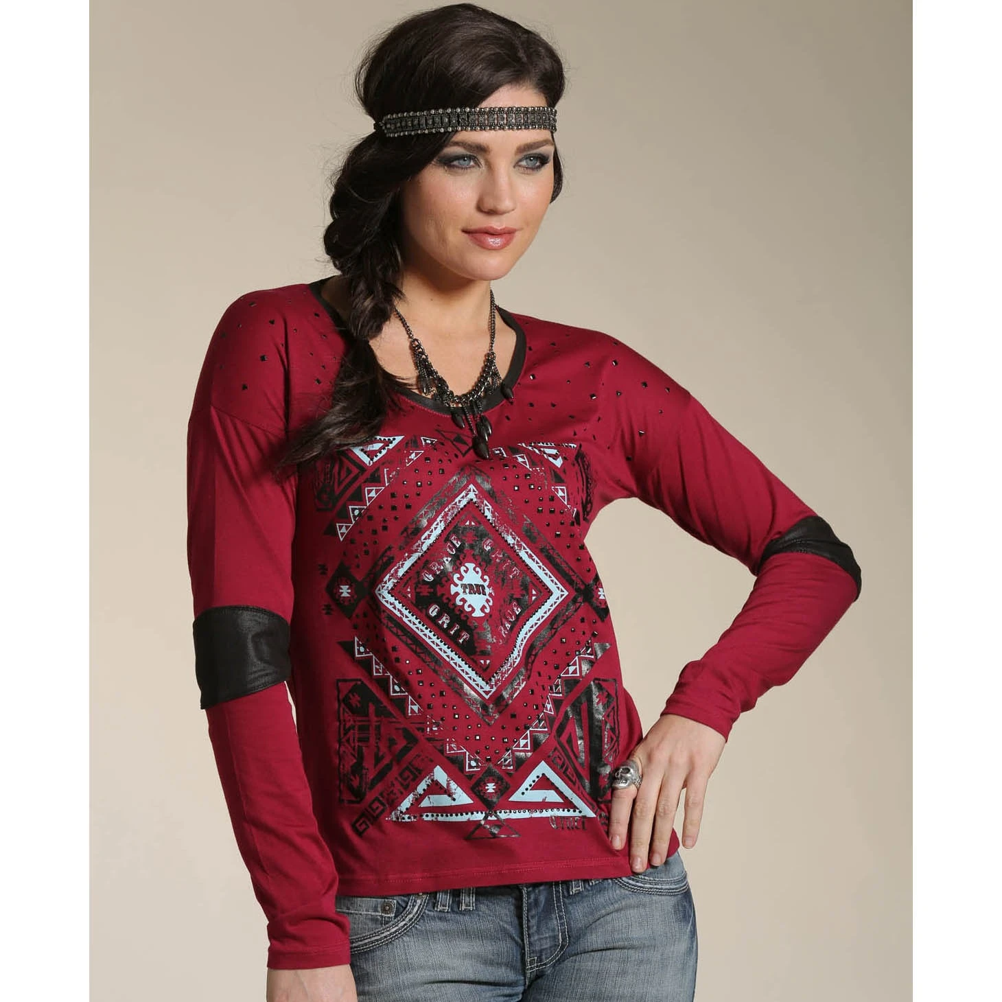 Cruel Girl Women’s Aztec design long sleeve shirt. Spice it up with this unique cotton top from Cruel Girl featuring a patched Aztec jersey design.