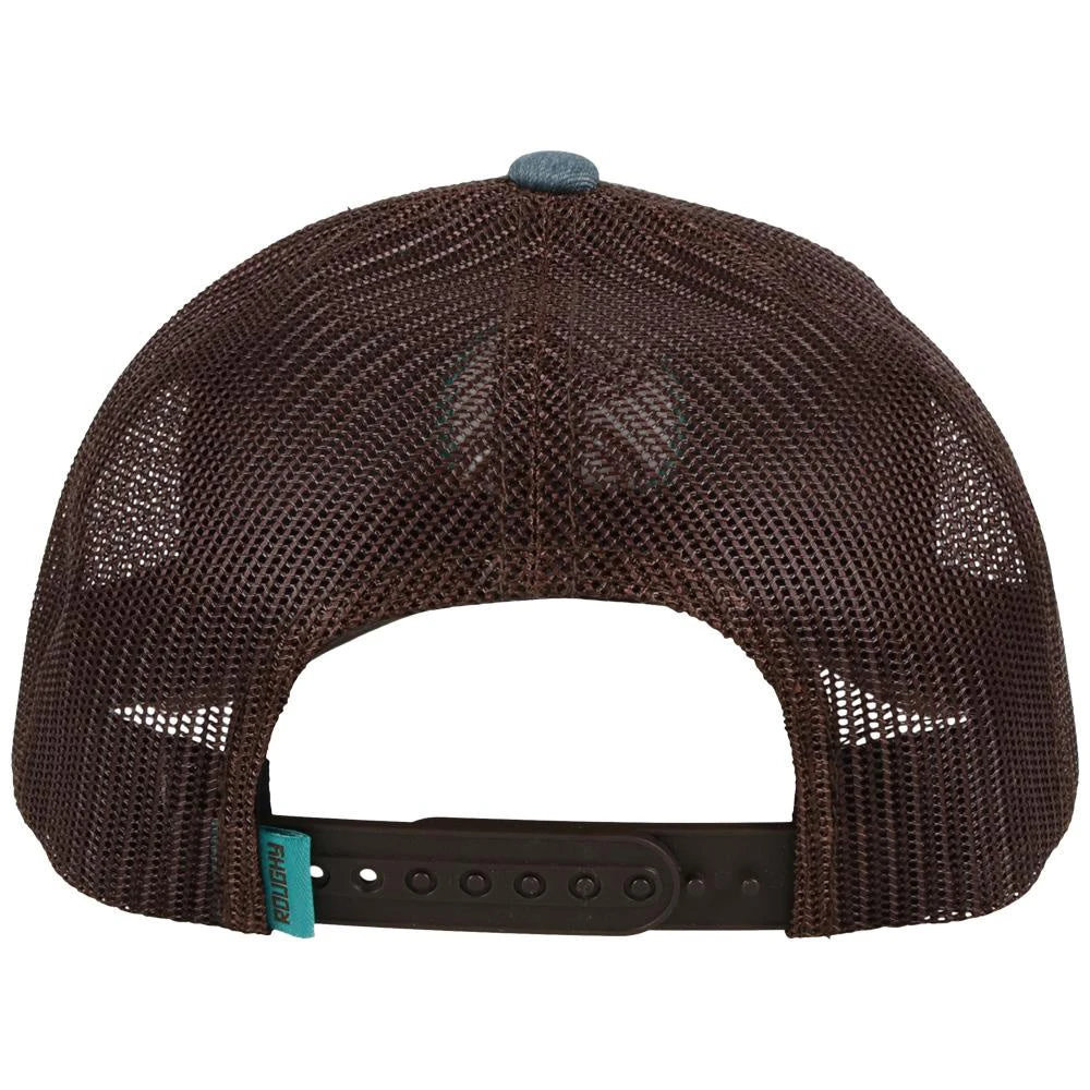 This great looking cap is offered in a mid-profile 6-panel body with a curved bill. Solid denim front with brown mesh back for ventilation. There is a contrasting ROUGHY tagĀ attached to an adjustable backstrap for fit. The puffed brown embroidery ROUGHY O patch stands in a turquoise Hooey O!