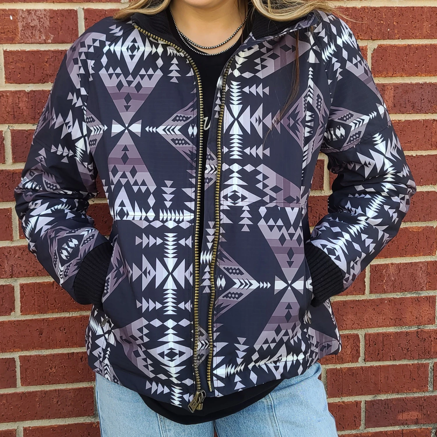 The Alamosa Fitted Coat from Pendleton is a trim, fitted jacket made with sustainable Sorona fibers and lofty fill to keep you warm and comfortable. The rib knit neck and wrist keeps out the chill. This gorgeous coat features the exclusive and authentic Diamond Peak Patter in Black and Grey. Â