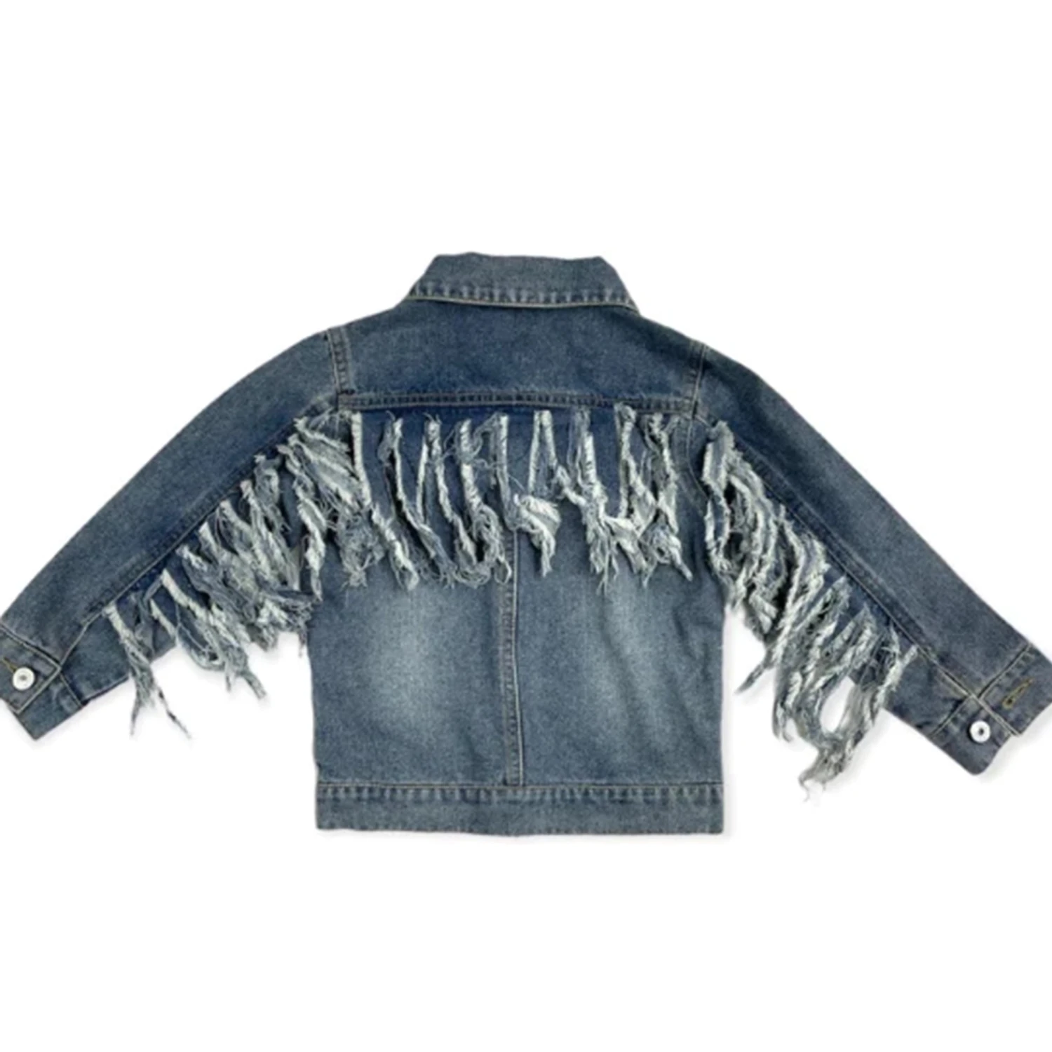 It does not get any cuter than this new Shea Baby denim fringe jacket! This jacket features fringe along the arms and across the back and also has buttons coming down the front, along with two front chest pockets.Â