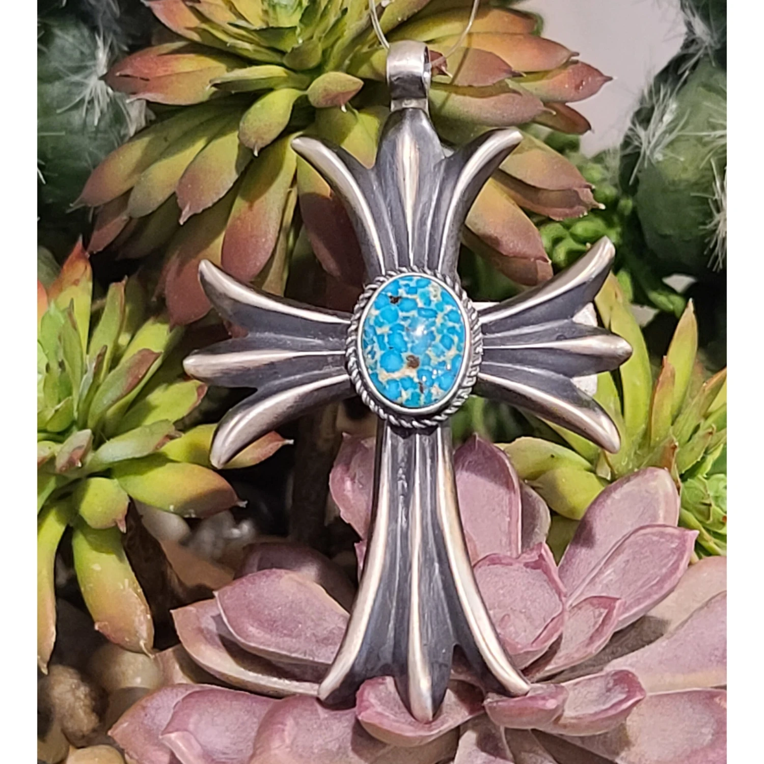 What a stunning Cross pendant. The Fox Turquoise in this piece is a vibrant turquoise color. The bail on this pendant is smaller will fit up to 5MM Navajo pearls or any silver chain you choose to wear it with.Â