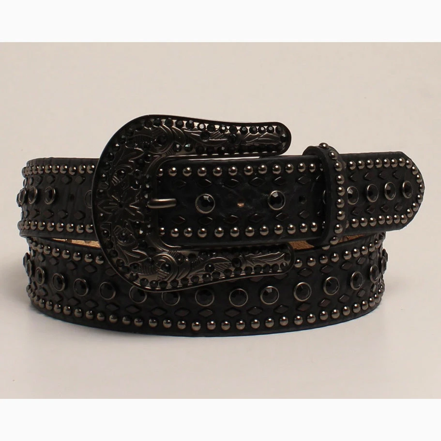 This women’s belt is all black and features a faux snake material! Black crystals run down the center followed by smaller ones on the sides!Â