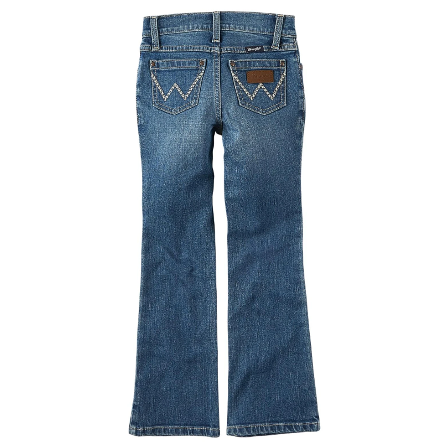 Wrangler Girls Jasmine Boot Cut Jean. This jean has a great wash and features the iconic Wrangler W pocket detail.Â