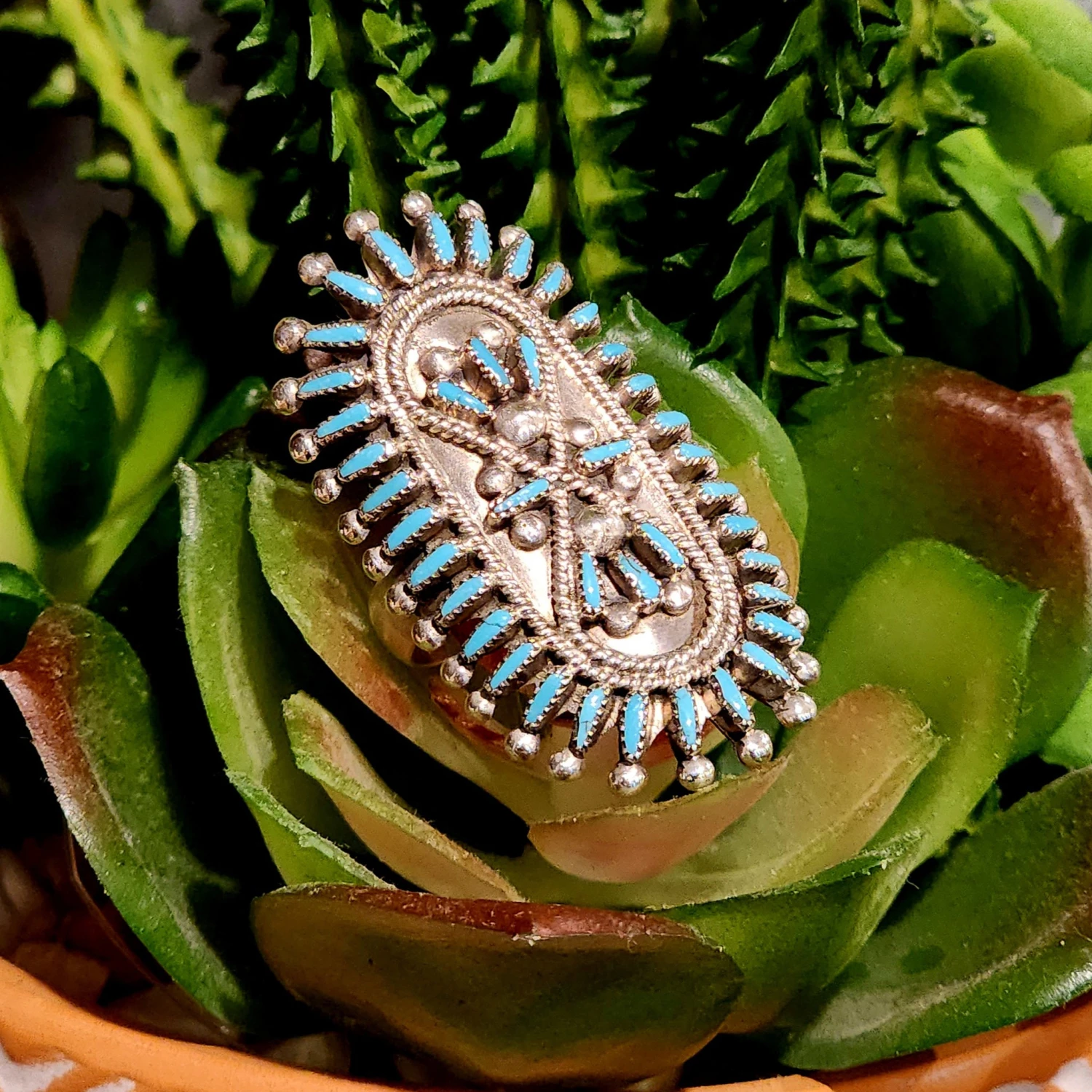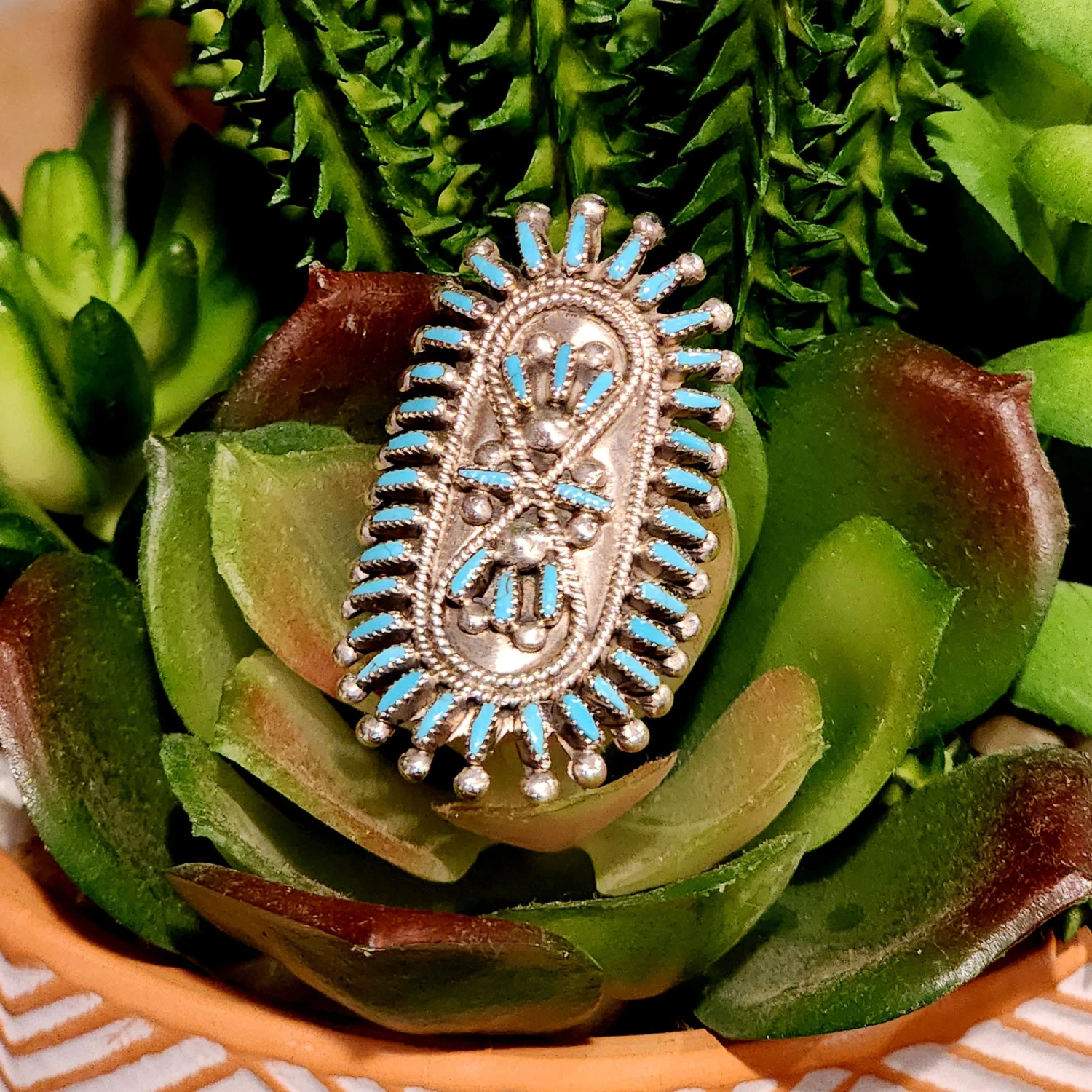 Just a beautiful Zuni made oval ring. The detail in the silver work and intricate turquoise work speak volumes.Â